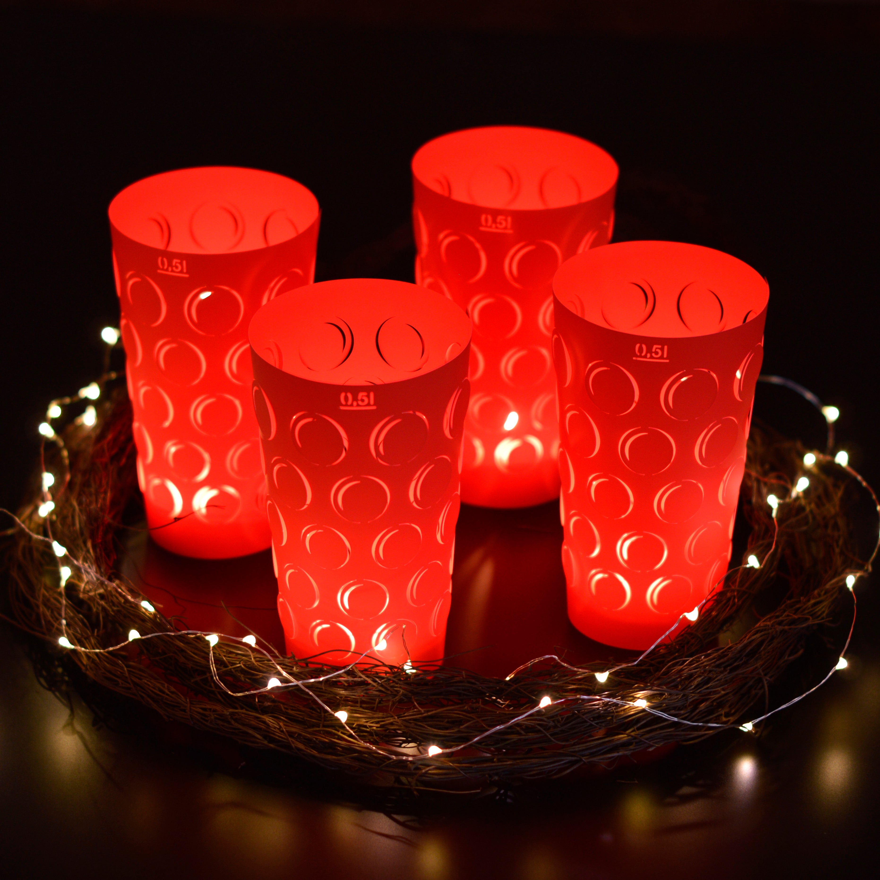 Als Teelichthalter kann ein handelsübliches Teelichtglas oder ein 0,5L oder ein 0,25L Dubbeglas verwendet werden.