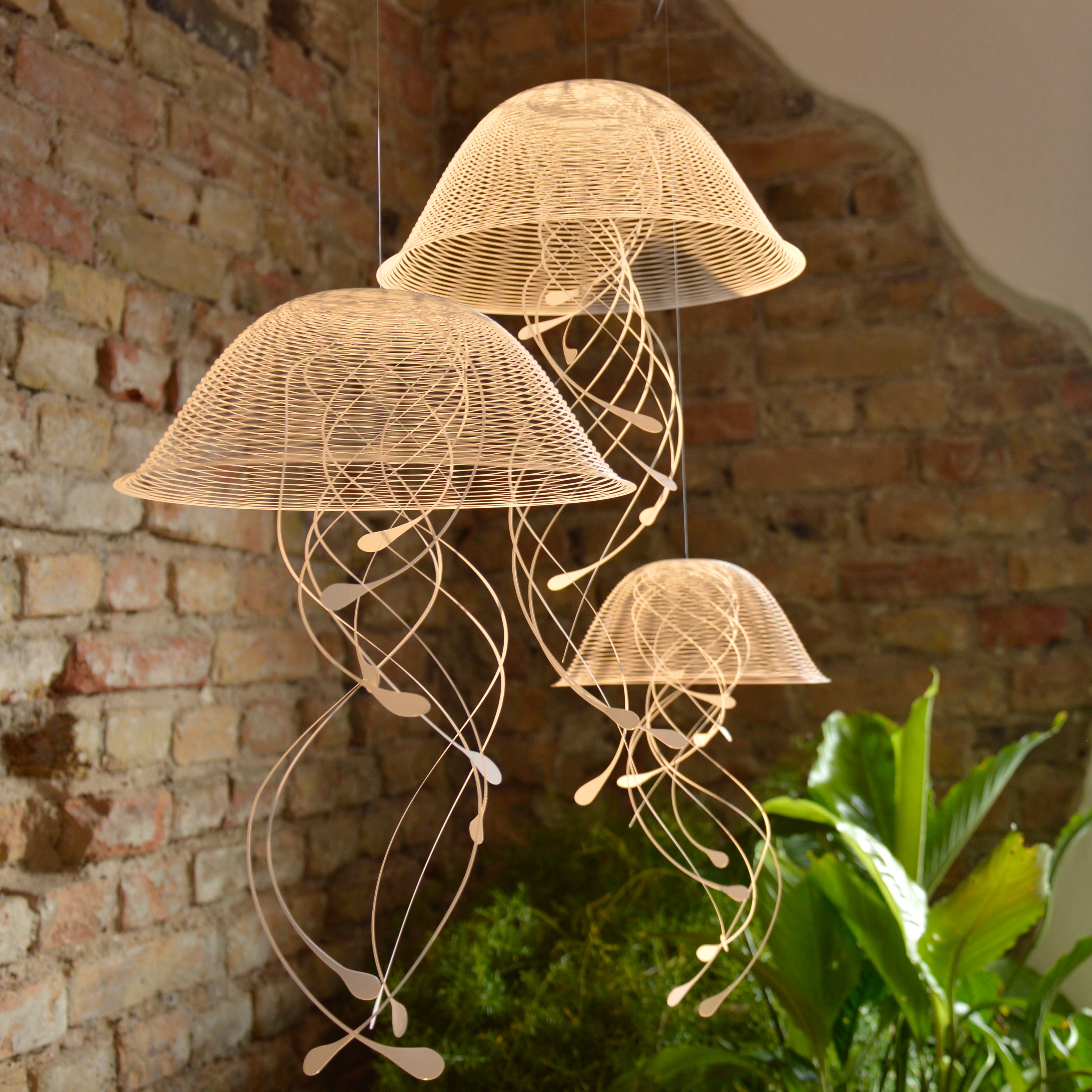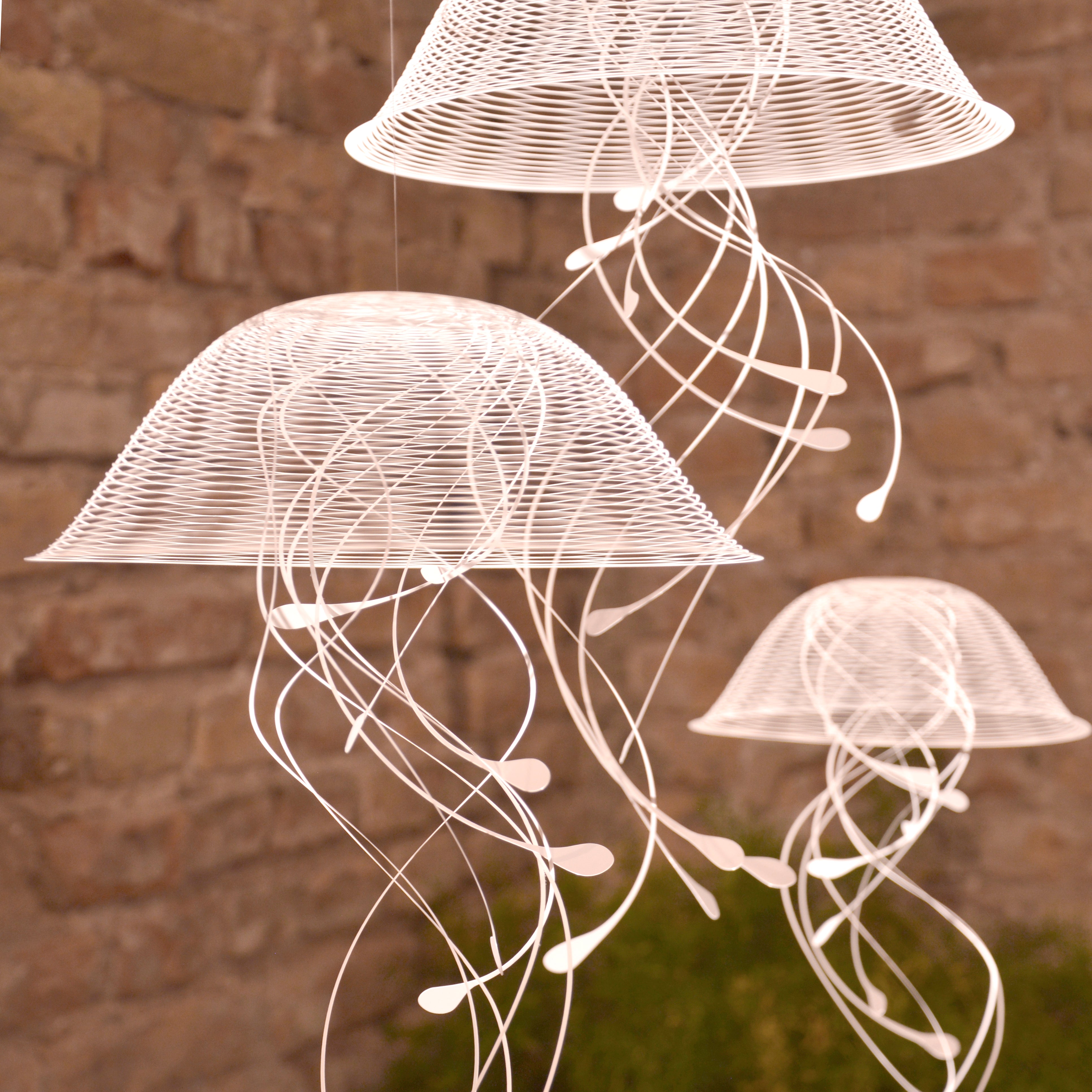 Beim Arrangieren der Jellindas haben Sie völlige Freiheit: Sie können sie enger beieinander oder weiter auseinander hängen. Mit den 150 cm langen, transparenten Nylonfäden lässt sich jede Skulptur individuell auf die gewünschte Höhe einstellen.